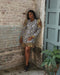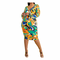 This Printed, short bodycon long sleeve dress with draped ruffles down one arm has a stretch Figure Flattering fit. This Look can transition from day to evening.