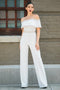 This fabulous jumpsuit, is trimmed in gold greek kept, has long sleeves, sits off the shoulder with a wide pant leg and stretchy fit.