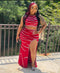 This Red sequin mermaid style dress has a v-neckline with short sleeve that sit on or off the shoulder, has a stretchy fit. It also has a scarf included. The look absolutely is stunning.