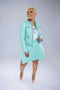 This button-down denim jacket has wide lapels, and two front pockets and is embellished with pearl studs and brass buttons. The jacket is true to size and the fabric is not stretchy. The model is wearing a size small.