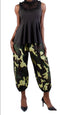 This chic pantsuit has a double-breasted jacket lining wide lapels and covered buttons. The jogger-style pants have an elastic waist and hem.